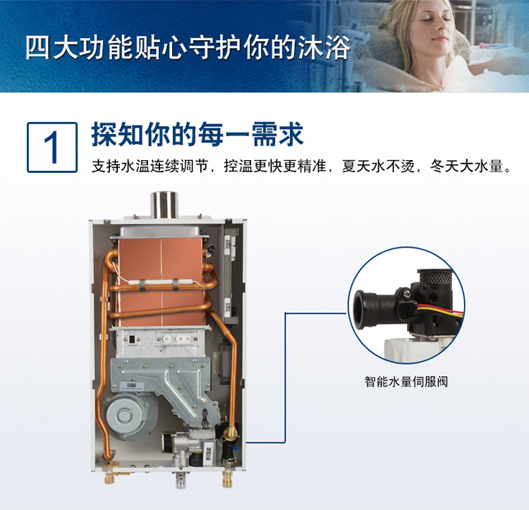 智能恒溫控制系統(tǒng),超寬頻水量調(diào)節(jié)。通過搭載伺服電機,根據(jù)設定溫度連續(xù)調(diào)節(jié)水量,舒適節(jié)能到極致。一氧化碳探測報警器,細心呵護您的安全。更有多點控制,可連接兩個遠程遙控器, 控制更方便快捷。